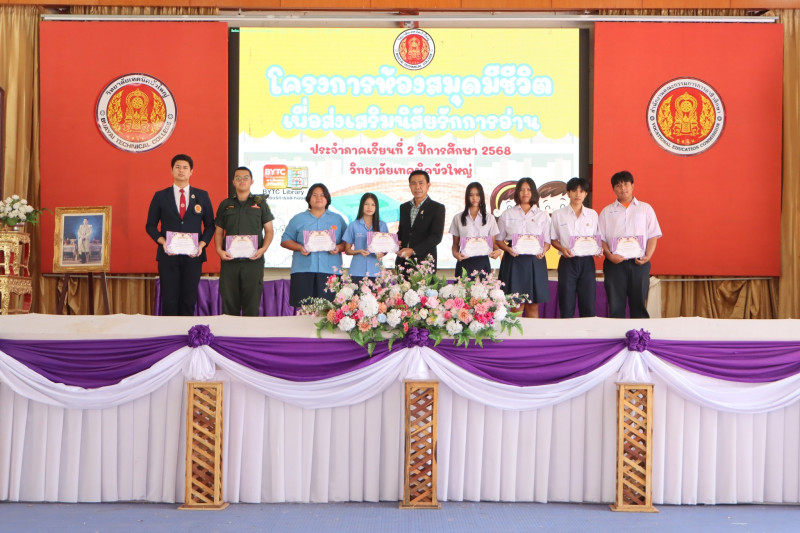 วันพุธที่ 4 กุมภาพันธ์ 2569 นายสุรชัย ผาโคตร ผู้อำนวยการวิทยาลัยเทคนิคบัวใหญ่ นำคณะผู้บริหาร ครู บุคลากรทางการศึกษา และนักเรียน นักศึกษา เข้าร่วมโครงการห้องสมุดมีชีวิต เพื่อส่งเสริมนิสัยการรักการอ่าน ประจำภาคเรียนที่ 2 ปีการศึกษา 2568 พร้อมมอบเกียรติบัตรเพื่อยกย่องเชิดชูเกียรติและสร้างขวัญกำลังใจ ให้แก่ครู และนักเรียน นักศึกษา ในการปลูกฝังและส่งเสริมนิสัยรักการอ่าน และการใฝ่รู้ใฝ่เรียนอย่างยั่งยืน ณ หอประชุมบัวฉลองขวัญ วิทยาลัยเทคนิคบัวใหญ่