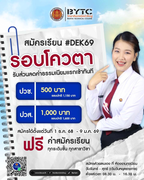 #วิทยาลัยเทคนิคบัวใหญ่ #BYTC #อำเภอบัวใหญ่ #อาชีวศึกษา #เรียนสายอาชีพ #สมัครเรียน69 #ปวช #ปวส #รอบโคตา